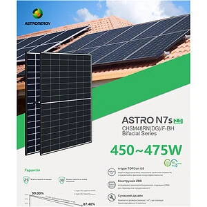 Солнечная батарея 460Вт N-type, BIFACIAL, CHSM48RN(DG)(BF)/F-BH ASTRONERGY — это высокоэффективный двусторонний (bifacial) фотомодуль нового поколения на базе технологии n-type TOPCon 5.0. Обеспечивает повышенную генерацию энергии благодаря работе с обеих сторон, имеет стильный дизайн без видимых шин (ZBB) и отличается высокой надежностью и длительным сроком службы.