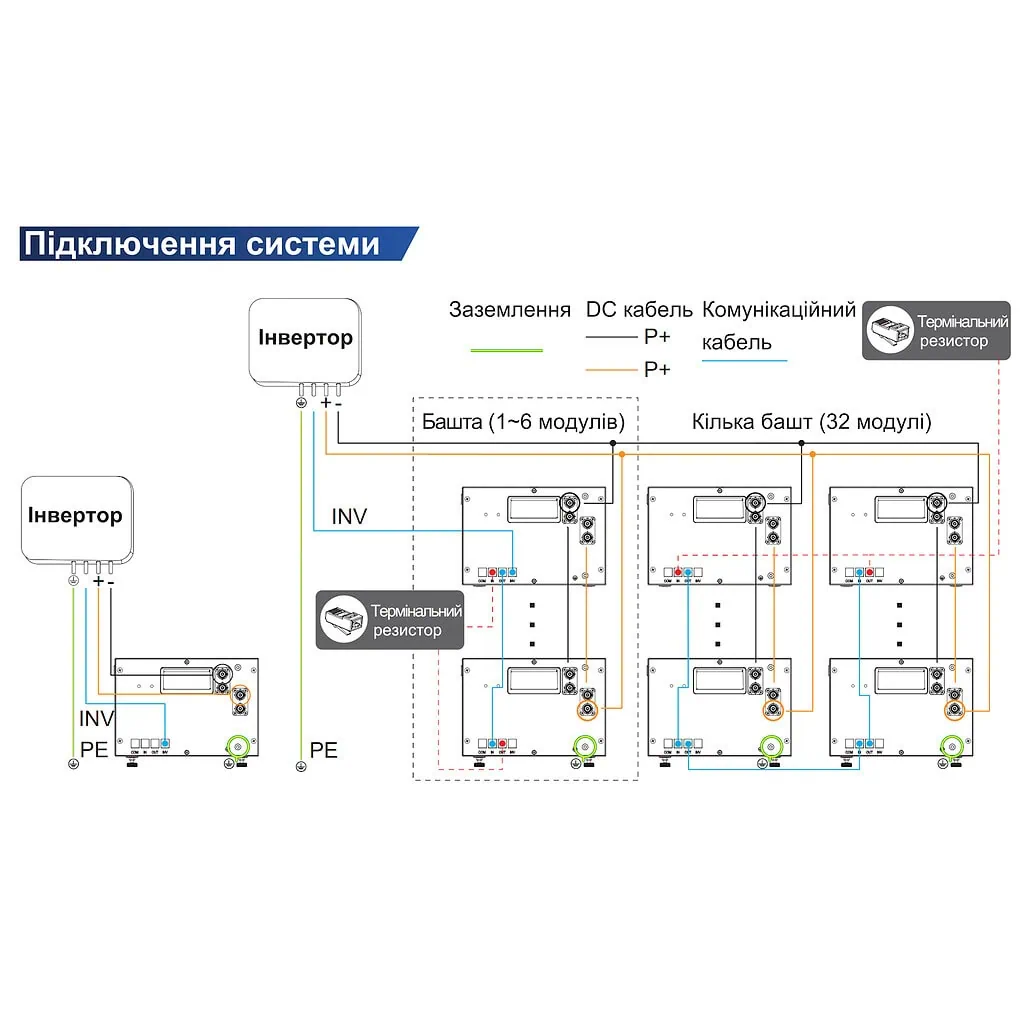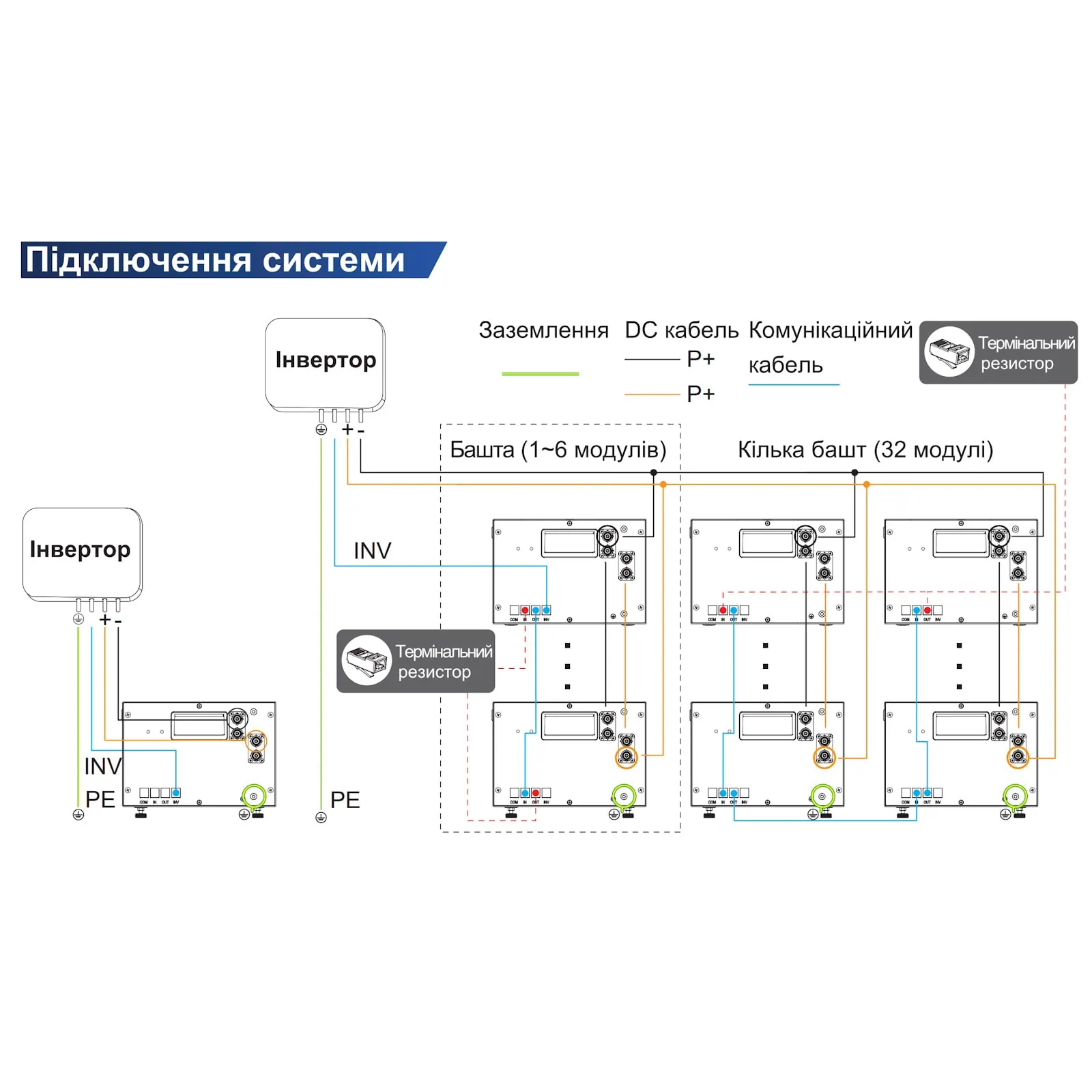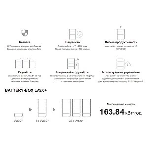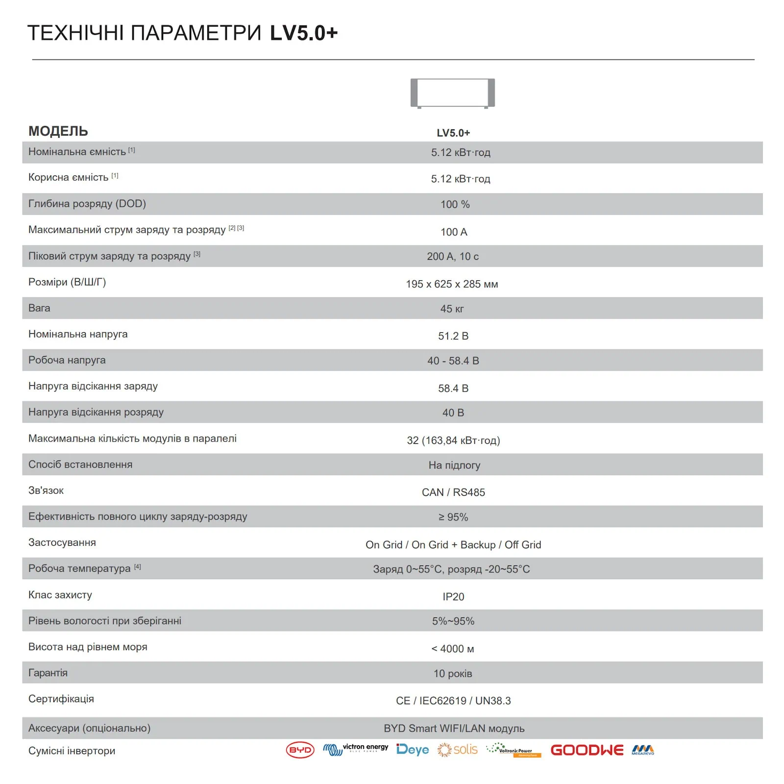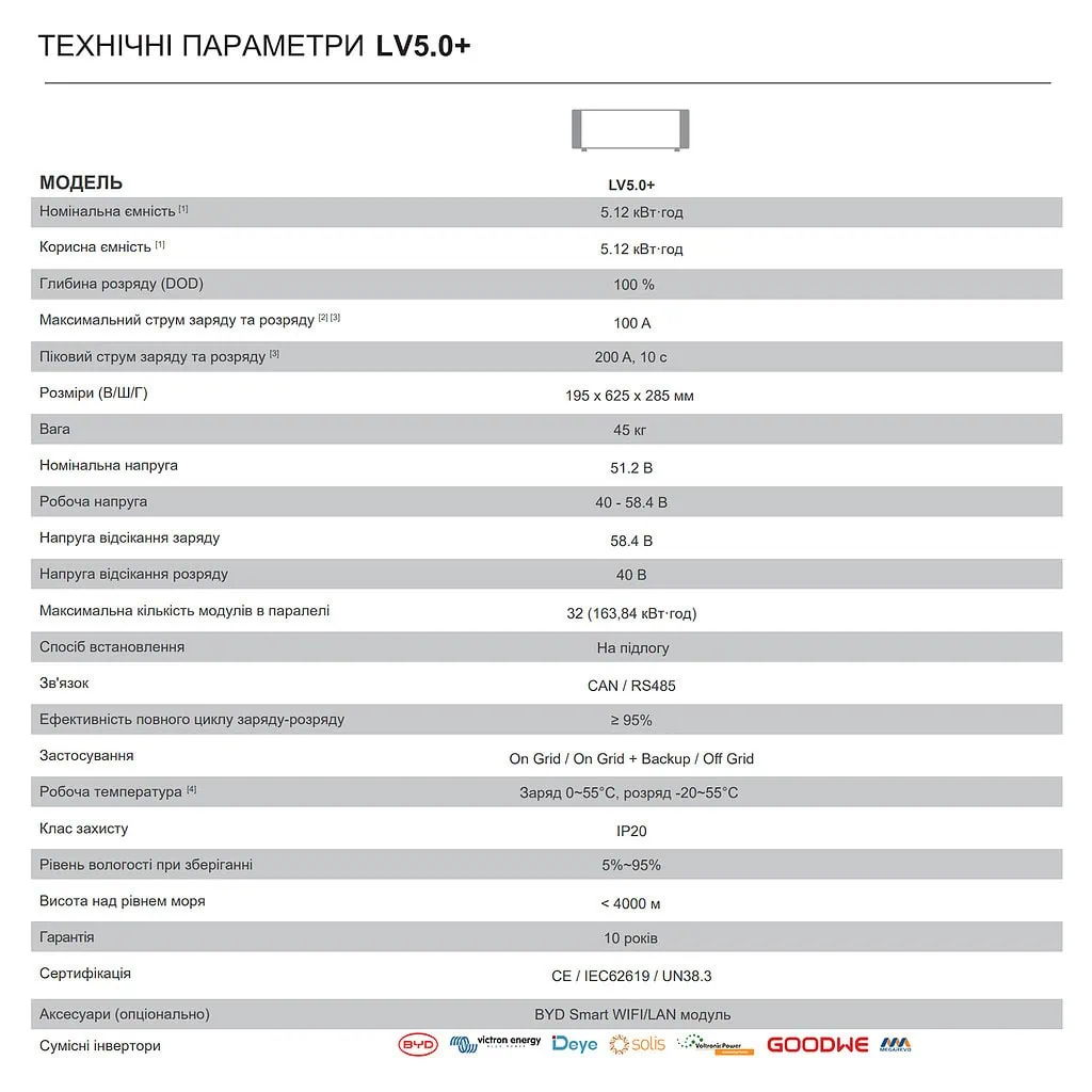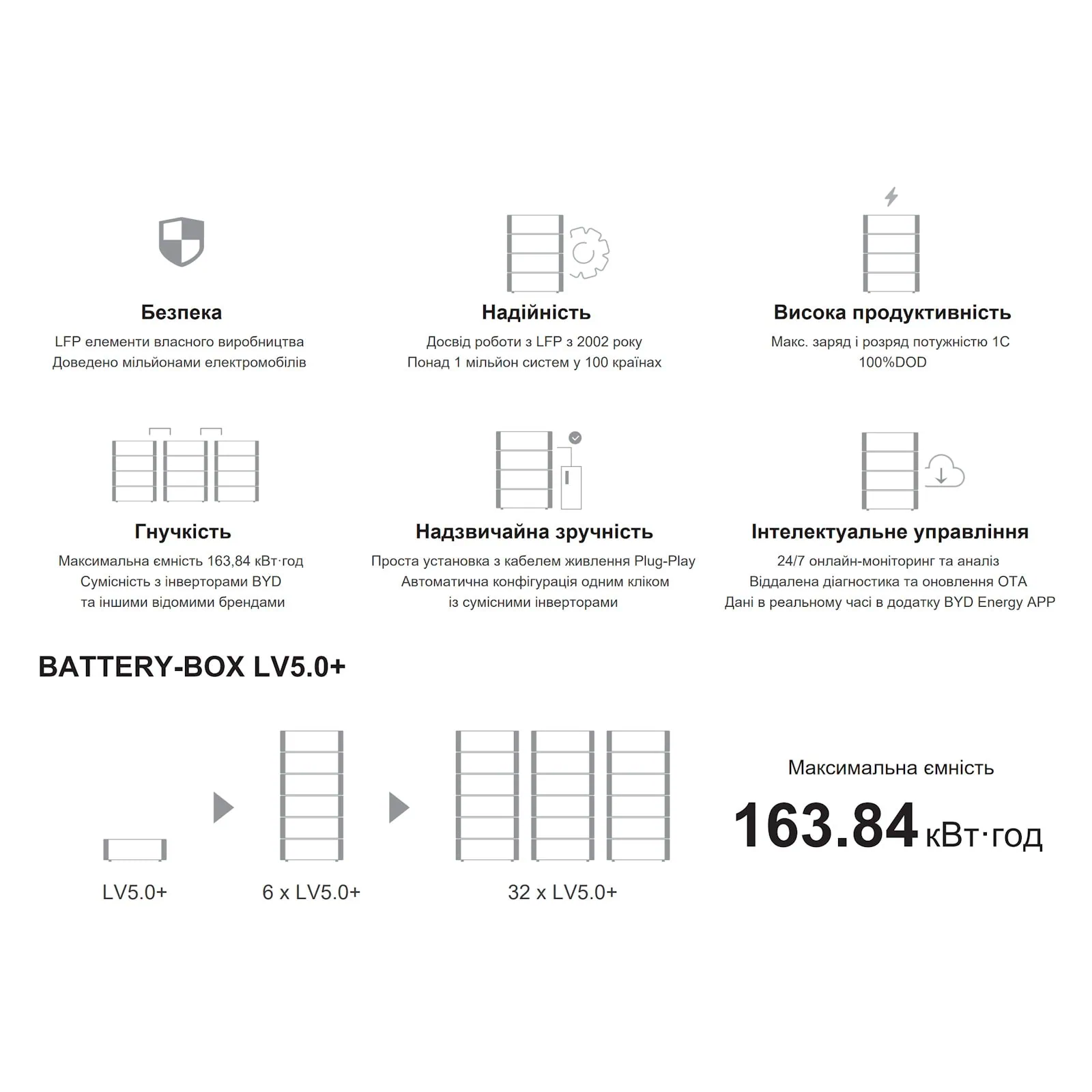 Battery-Box LV5.0+ — новейшая низковольтная аккумуляторная батарея от BYD. В конструкции батареи используются ячейки LFP собственной разработки, проверенные в миллионах электромобилей. Основными преимуществами LV5.0+ являются: — максимальная мощность заряда/разряда – 1С, 100А — пиковая мощность разряда – 200А, 10с — максимальная глубина заряда – 100% — башенная установка без дополнительных крепежей — максимальная высота башни в 6 модулей — максимальный размер установки хранения энергии в 32 батареи или 163,84 кВтч — простая установка Plug-and-Play, автоматическая настройка с совместимыми инверторами одним нажатием — гарантия производителя – 10 лет
