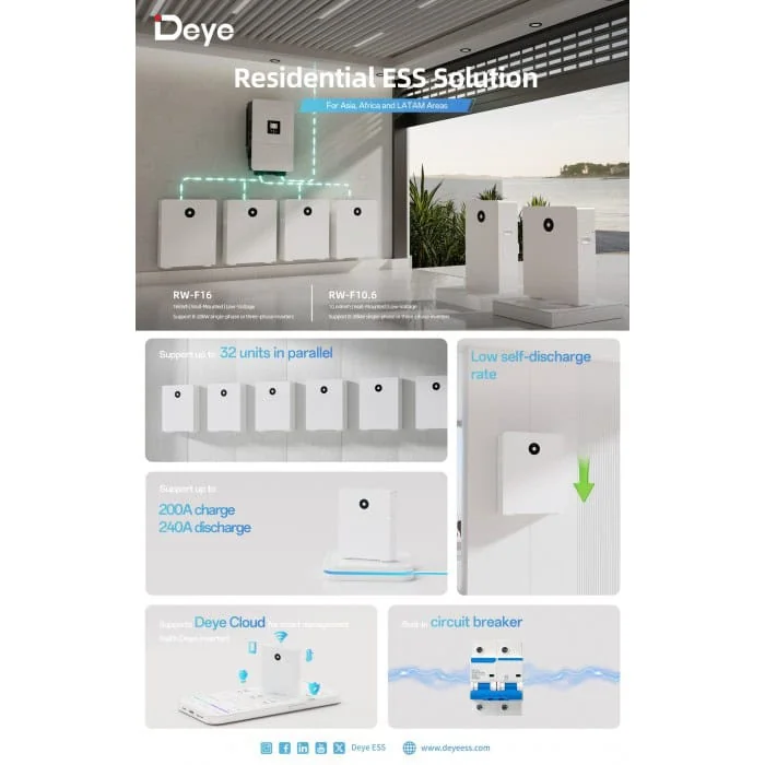 Deye RW-16 — это инновационная система хранения энергии для жилых помещений, разработанная для повышения энергоэффективности и надежности. Благодаря передовым функциям безопасности, гибкости в эксплуатации и высокой производительности, это устройство станет идеальным выбором для современных домохозяйств, стремящихся оптимизировать использование энергии.
