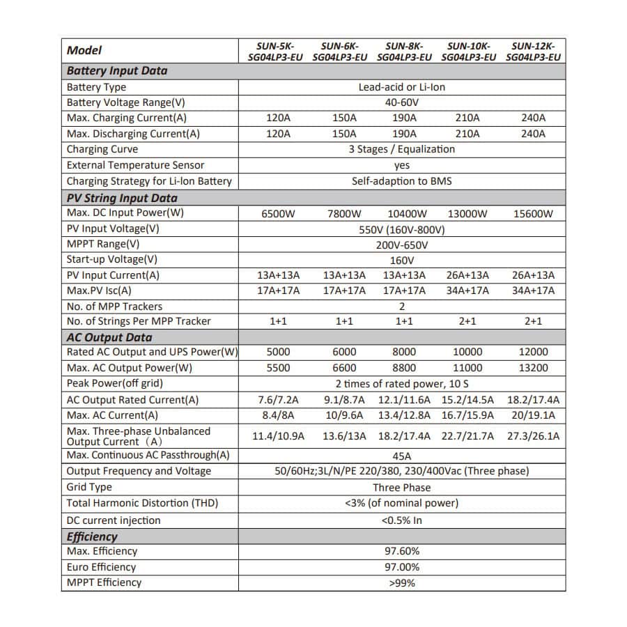 Deye SUN-12K-SG04LP3-EU – современный трехфазный гибридный инвертор имеет мощность 12000Вт, напряжение аккумуляторных батарей 48В, что сможет обеспечить надежную электропитание. Поддержка трехфазного тока дает возможность широкого применения устройства.