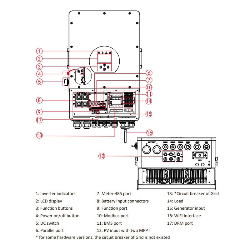 - В инвертор встроены два MPPT трекера, к которым можно подключить три стринга солнечных панелей (2 на первый и 1 на второй). В этом случае солнечные батареи можно монтировать на разных сторонах крыши, либо на земле, последовательно, либо параллельно. Входящий ток трекера: 34А+17А. Входное напряжение: 200-650В.