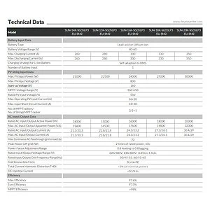 - В инвертор встроены два MPPT трекера, к которым можно подключить 4 стринга солнечных панелей (2 на первый и 2 на второй). В этом случае солнечные батареи можно монтировать на разных сторонах крыши, либо на земле, последовательно, либо параллельно. Входящий ток трекера: 36А+20А. Входное напряжение: 200-650В.