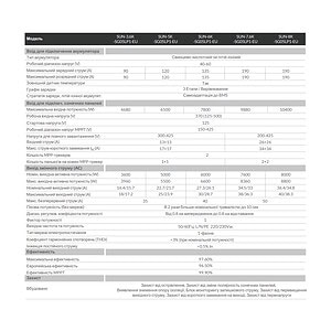 Данная модель инвертора Deye имеет возможность подключения двух солнечных полей с током до 26 А. Диапазон работы контроллера MPPT составляет 125-425 В, стартует инвертор на 150 В, а верхняя граница напряжения поля 500 В. В идеальном для инвертора случае солнечные панели стоит подбирать из расчета номинального напряжения МРРТ 370 В. В паспорте указана максимальная суммарная мощность 10400 Вт, но по электрическим параметрам МРРТ может быть и больше, на современных панелях до 6000 Вт на один МРРТ.
