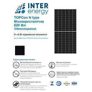 Модель Inter Energy IE182x182/M/66/MH/620W демонстрирует рекордный КПД 23,99%, что ставит ее в число самых производительных панелей на украинском рынке солнечной энергетики. Продвинутый Н-ТИП технология с монокристаллическими ячейками диаметром 182 мм обеспечивает минимальную светоиндуцированную деградацию (LID) и улучшенные характеристики при повышенных температурах. Инновационная архитектура Half-Cell снижает внутренние потери и повышает производительность даже в условиях частичного затенения.