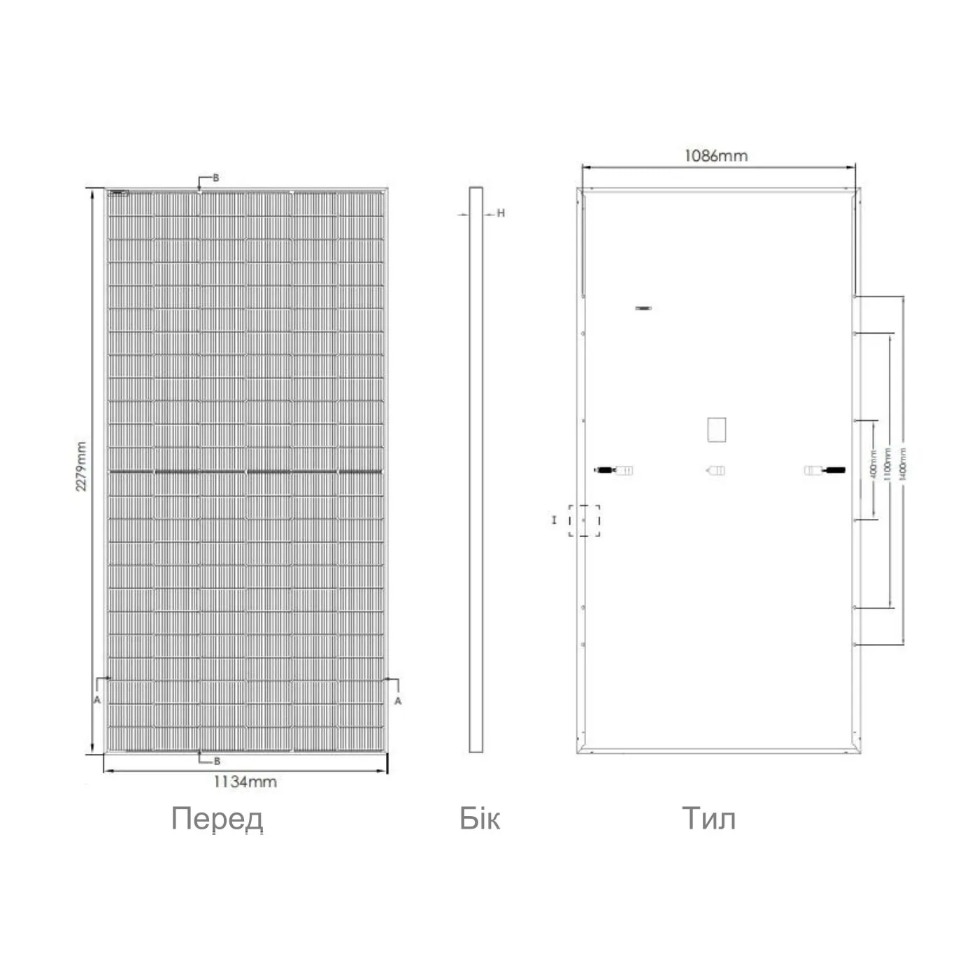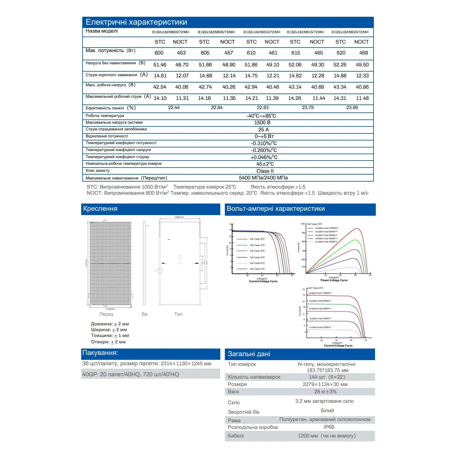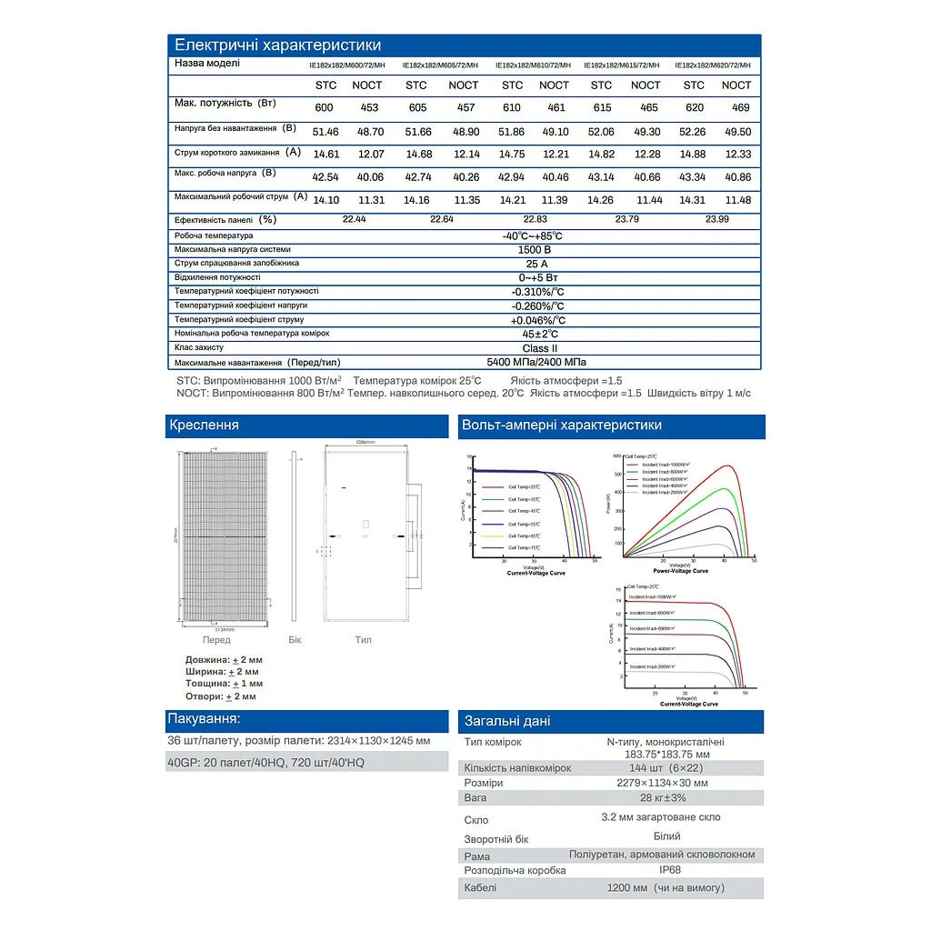 Панель Inter Energy IE182x182/M/66/620MH 620 Вт оснащена монокристаллическими элементами N-типа диаметром 182 мм для достижения номинальной мощности 620 Вт. Выдающийся коэффициент преобразования солнечной энергии 23,99% делает эту модель одной из самых эффективных в своем классе. Электрические параметры включают напряжение холостого хода 52,26 В, максимальное рабочее напряжение 43,34 В, ток короткого замыкания 14,88 А и максимальный рабочий ток 14,31 А. Габаритные размеры 2279×1134×30 мм при весе 28 кг обеспечивают оптимальный баланс между мощностью и практичностью установки.