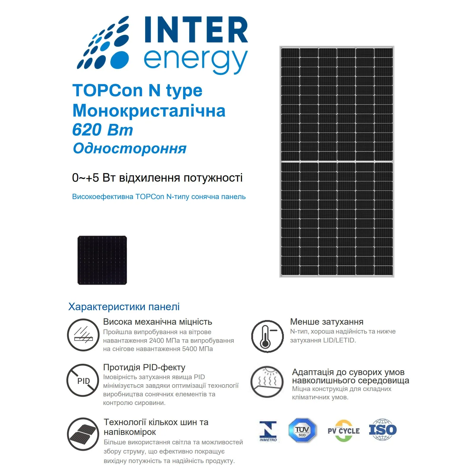 Модель Inter Energy IE182x182/M/66/MH/620W демонстрирует рекордный КПД 23,99%, что ставит ее в число самых производительных панелей на украинском рынке солнечной энергетики. Продвинутый Н-ТИП технология с монокристаллическими ячейками диаметром 182 мм обеспечивает минимальную светоиндуцированную деградацию (LID) и улучшенные характеристики при повышенных температурах. Инновационная архитектура Half-Cell снижает внутренние потери и повышает производительность даже в условиях частичного затенения.