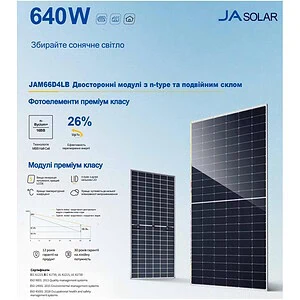 Модель JAM66D45-630/LB — это современная монокристаллическая солнечная панель с технологией Bifacial Double Glass, которая вырабатывает электроэнергию не только с лицевой стороны, но и за счёт отражённого света. Благодаря двусторонней генерации и n-type элементам панель обеспечивает повышенную производительность, стабильную работу и пониженный уровень деградации на протяжении всего срока эксплуатации.