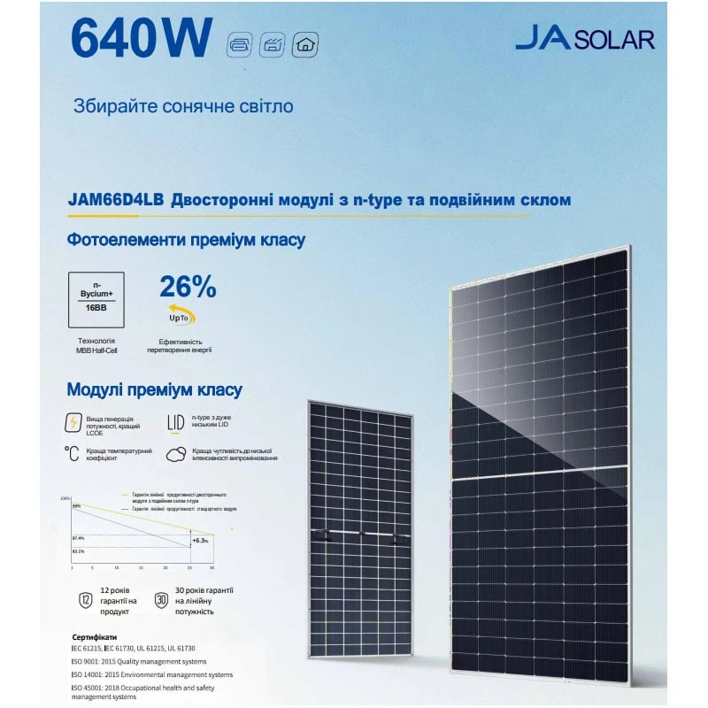 Модель JAM66D45-630/LB — это современная монокристаллическая солнечная панель с технологией Bifacial Double Glass, которая вырабатывает электроэнергию не только с лицевой стороны, но и за счёт отражённого света. Благодаря двусторонней генерации и n-type элементам панель обеспечивает повышенную производительность, стабильную работу и пониженный уровень деградации на протяжении всего срока эксплуатации.