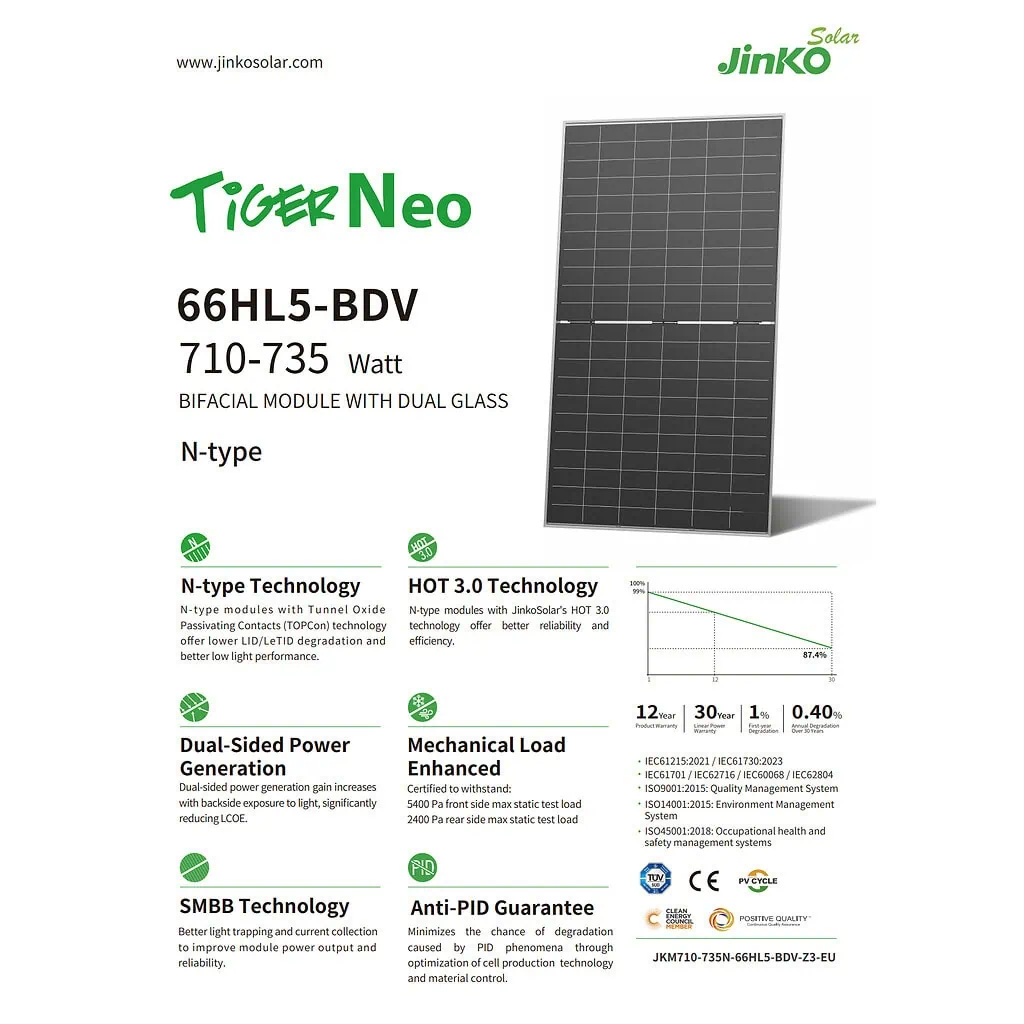 Солнечная панель Tiger Pro JKM-720N-66HL5-BDV – это высокоэффективный монокристаллический модуль от ведущего мирового производителя Jinko Solar. Основными преимуществами является большая на 26% обычных модулей мощность и ниже внутренний ток и температура горячей точки.
