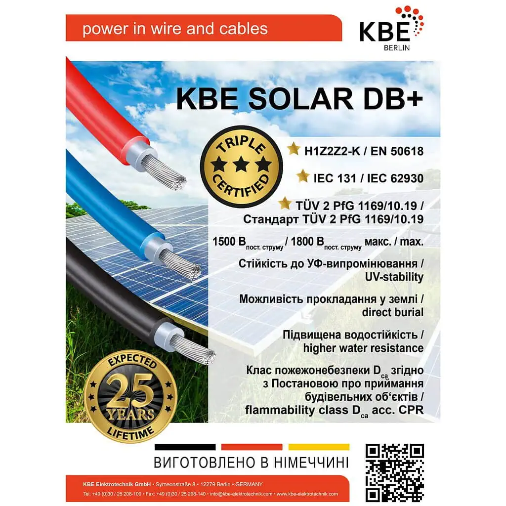 – немецкое качество, тройная сертификация (EN 50618; IEC 62930; TÜV 2Pfg 1169 /10.2019);