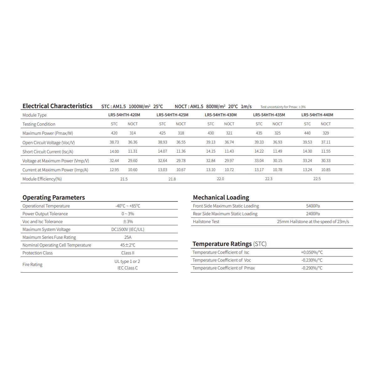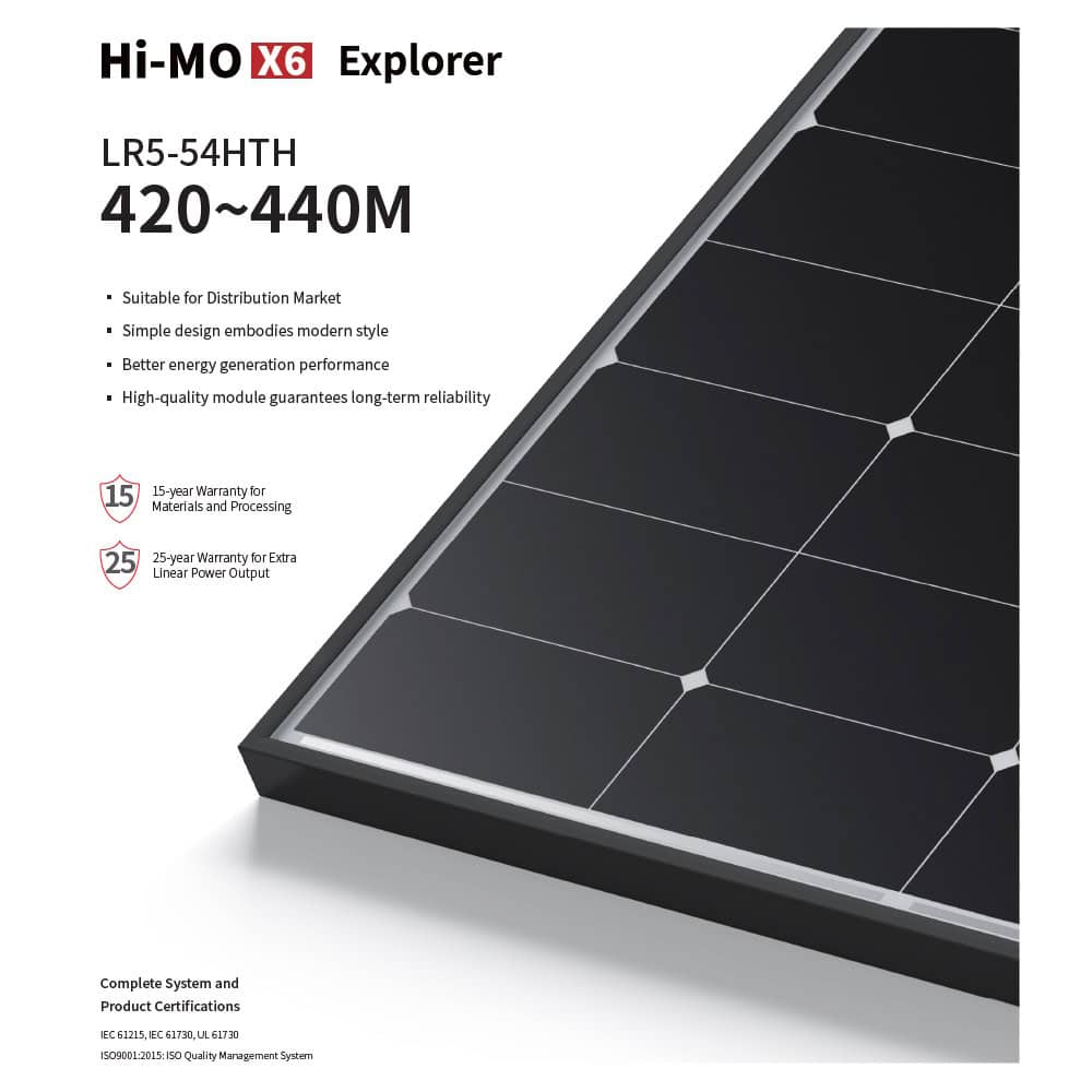 Longi LR5-54HTH 440 W Солнечная панель (черная рама) является эффективным и надежным решением для коммерческих и жилых систем. Его характеристики обеспечивают высокую производительность и долговечность в работе, что делает эту модель оптимальным выбором для инвестирования в солнечную энергию. Благодаря сочетанию современных технологий, механической надежности и эстетического дизайна, панели Longi LR5-54HTH удовлетворяют требованиям сегодняшнего рынка и могут стать важным элементом вашей энергетической стратегии.