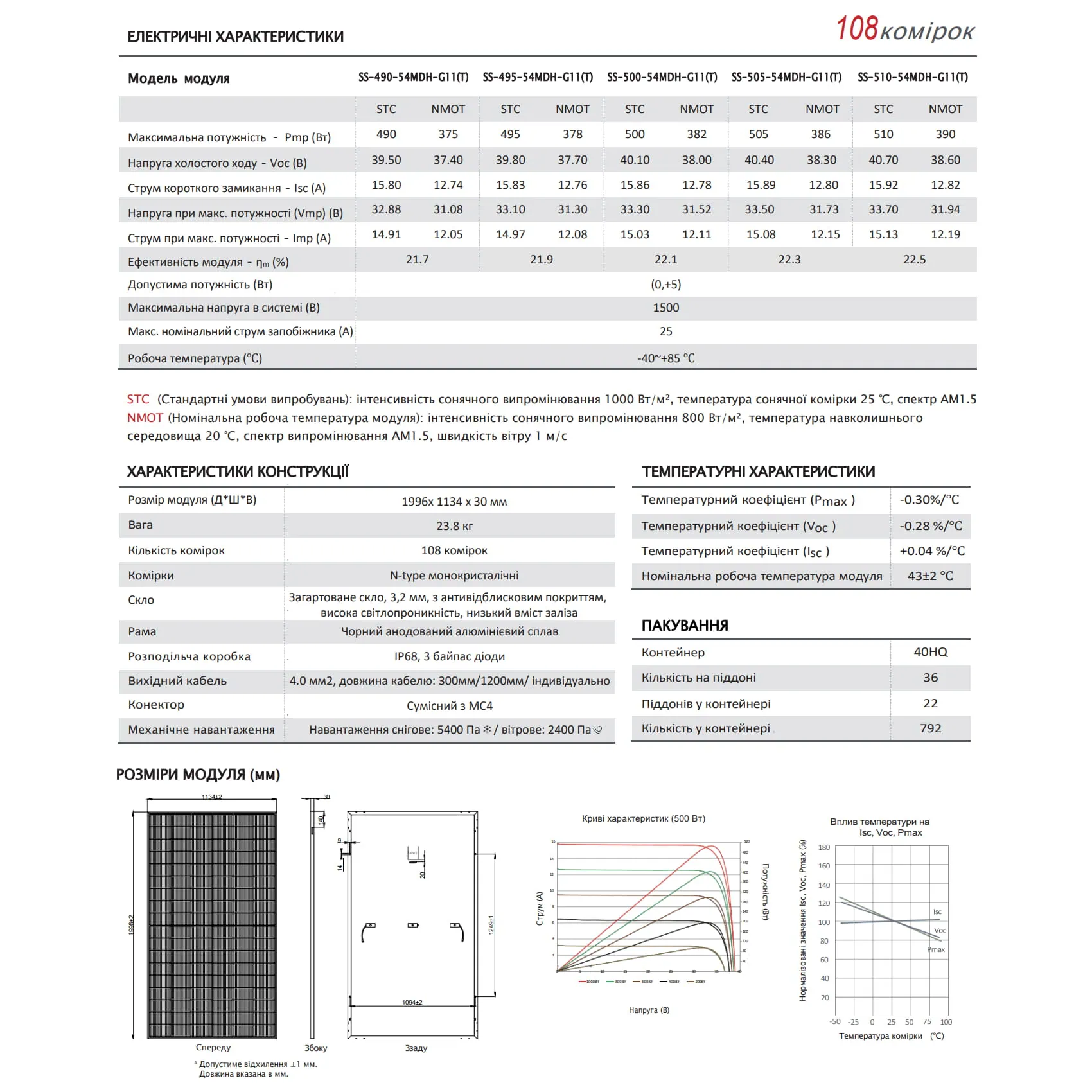 Солнечная батарея 510 Вт N-type, SS-510-54MDH-G11(T), Sunova Solar — это высокоэффективный монокристаллический фотомодуль нового поколения с технологией N-type half-cell с односторонней генерацией и стильным дизайном Full Black.
