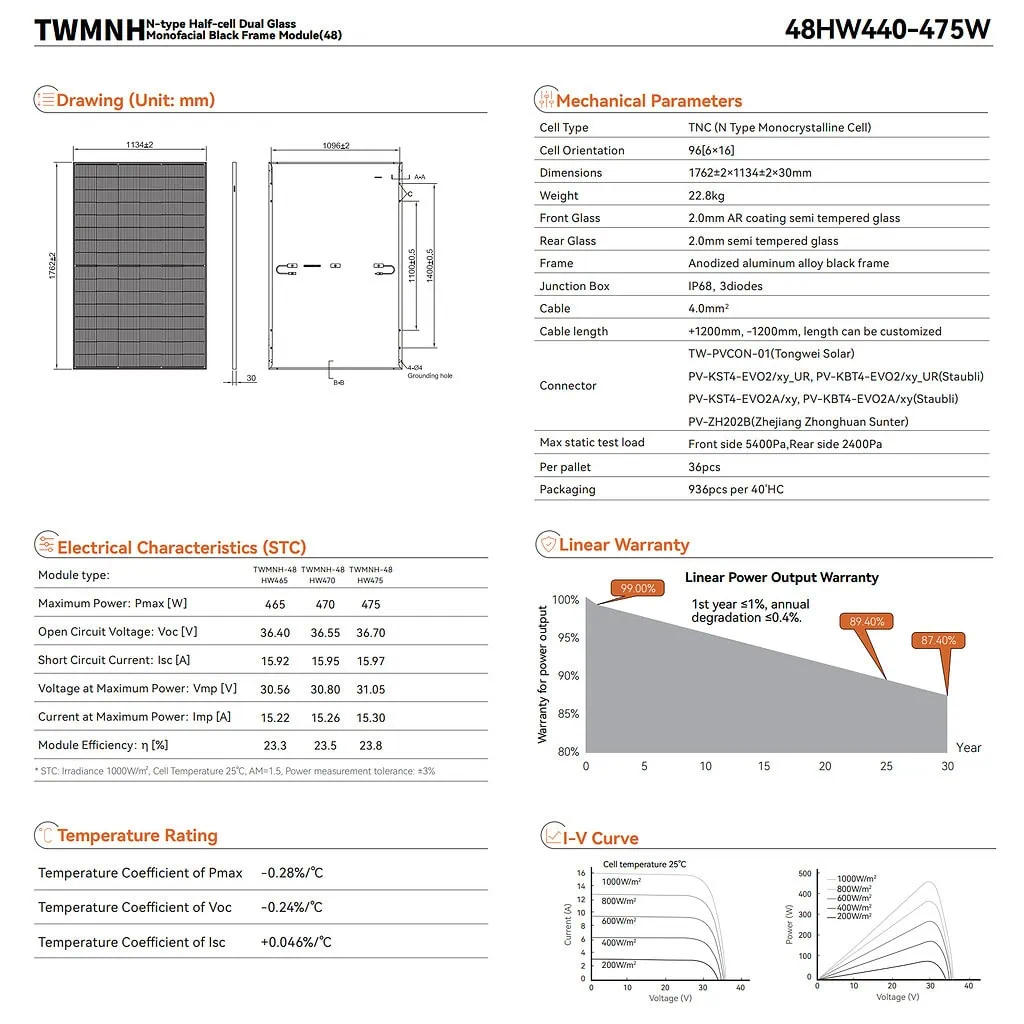 Эта односторонняя N-type солнечная панель от Tongwei обеспечивает высокую эффективность и надёжность. Благодаря технологии Half-Cell и Dual-glass конструкции модуль отличается повышенной прочностью, снижением потерь мощности и стабильной работой на протяжении десятилетий.