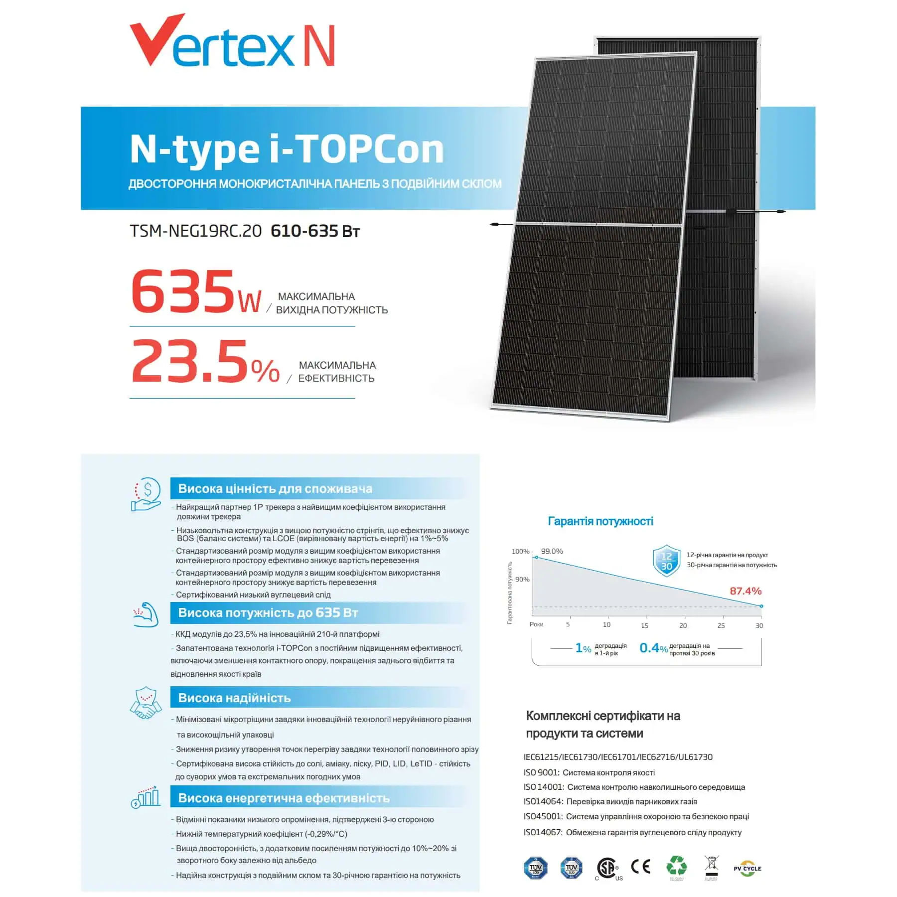 Технология N-type обеспечивает минимальную начальную деградацию и отличную работу при высоких температурах, что важно для украинского климата с жаркими летними месяцами. Высокая эффективность 22,6% означает получение наибольшего количества электроэнергии с каждого квадратного метра площади. Это делает Trina TSM-620M NEG19RC.20 идеальным выбором для проектов с высокими требованиями к производительности.
