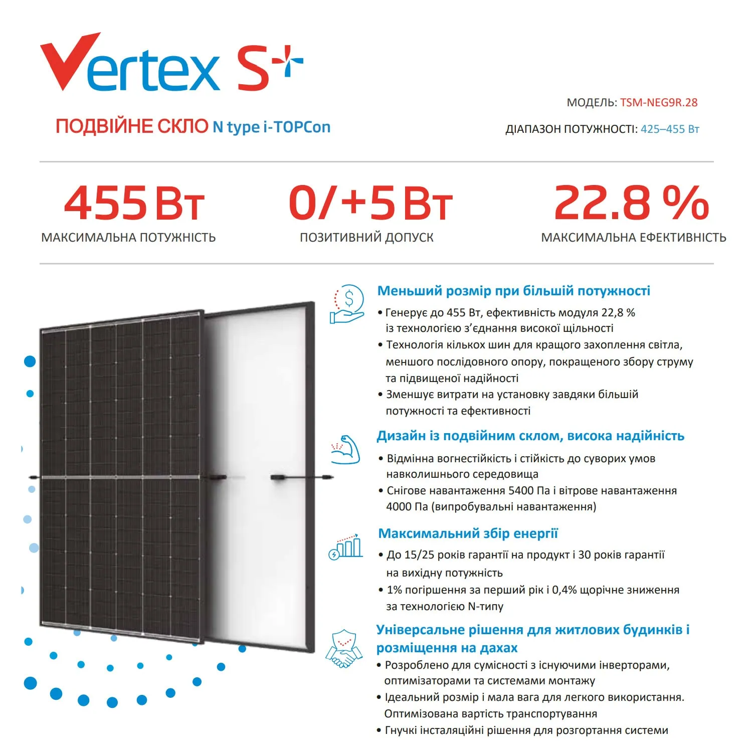 Trina Solar TSM-450 NEG9R.28 Vertex S+ N-type — это монокристаллическая солнечная панель мощностью 455 Вт, представляющая новое поколение высокоэффективных модулей. Благодаря технологии N-типа и двойному стеклу эта панель обеспечивает долговременную стабильность и производительность на уровне 22,8%.