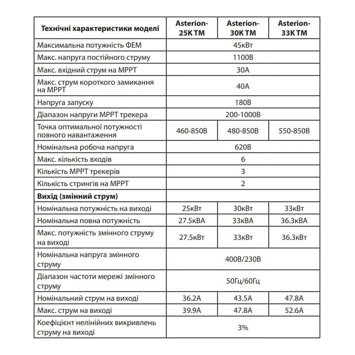 - Вихідна потужність: до 33 кВт, 230/400 В, 3 фази