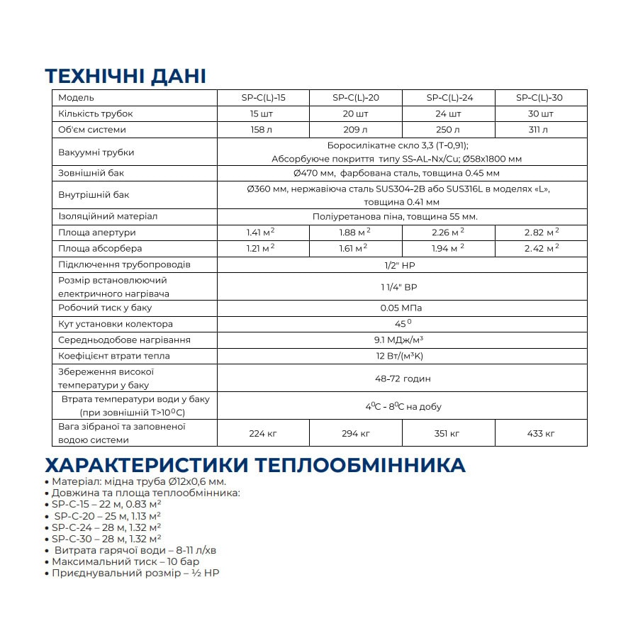 • Вакуумні трубки: 24 штук, звичайні “наповнювані водою” (ALN/AIN-SS/Cu) Ø58*1800 мм