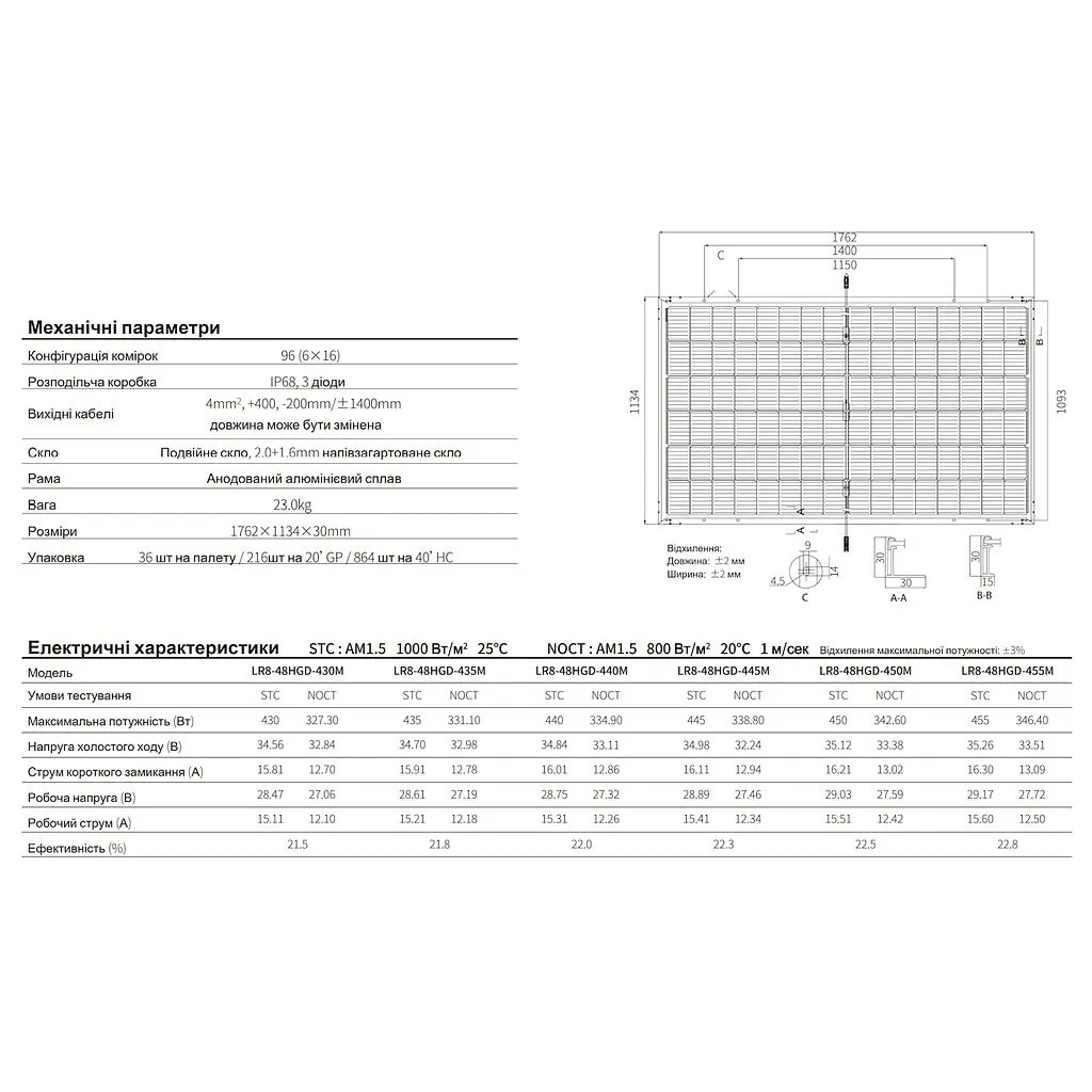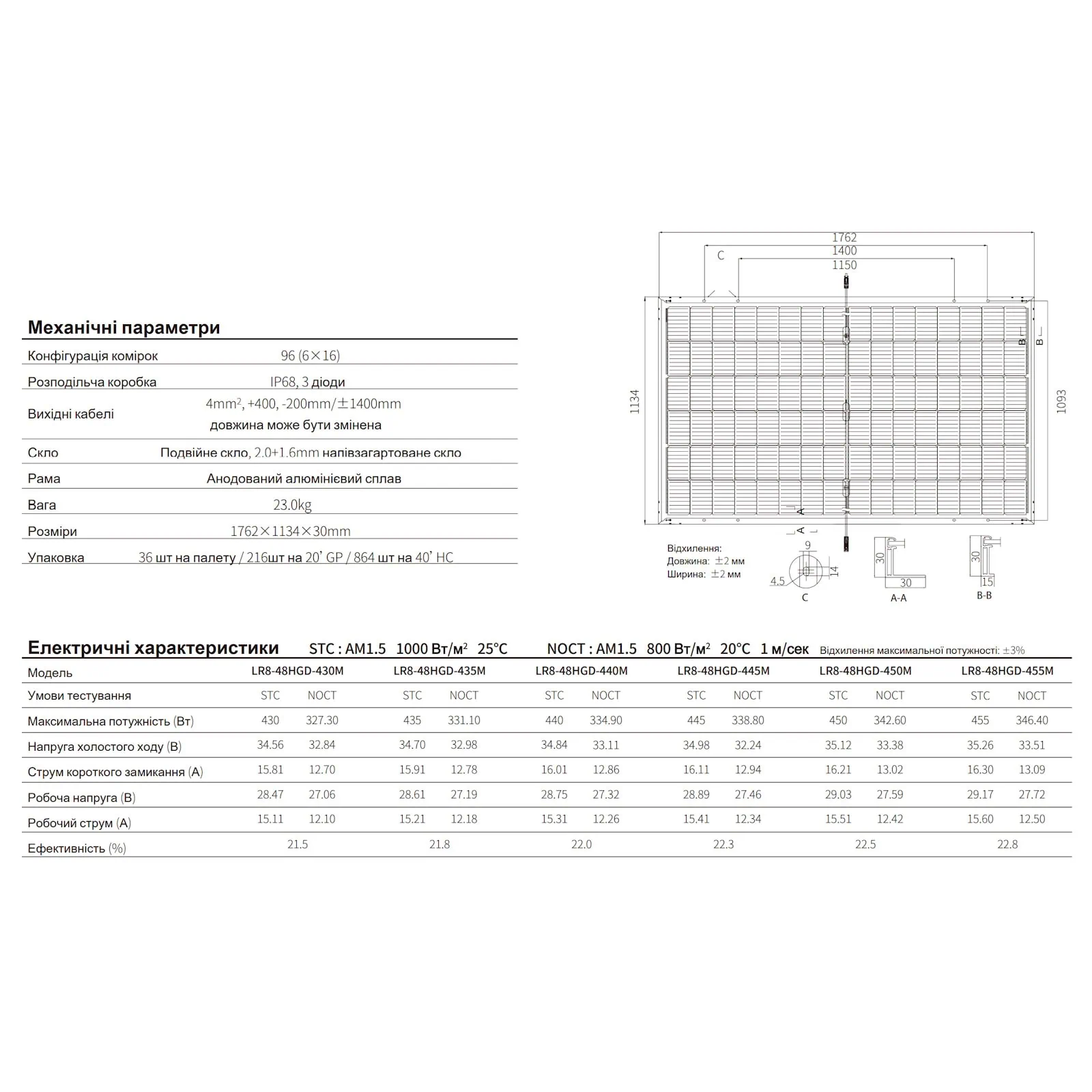 Модель LONGi LR8-48HGD-445 Вт – це сучасна, ефективна та надійна сонячна панель, що поєднує в собі високий ККД, технологію bifacial, міцну конструкцію та тривалу гарантію. Завдяки цим характеристикам вона може стати відмінним вибором як для приватного будинку, так і для комерційних проектів з підвищеними вимогами до енергоефективності та довговічності.