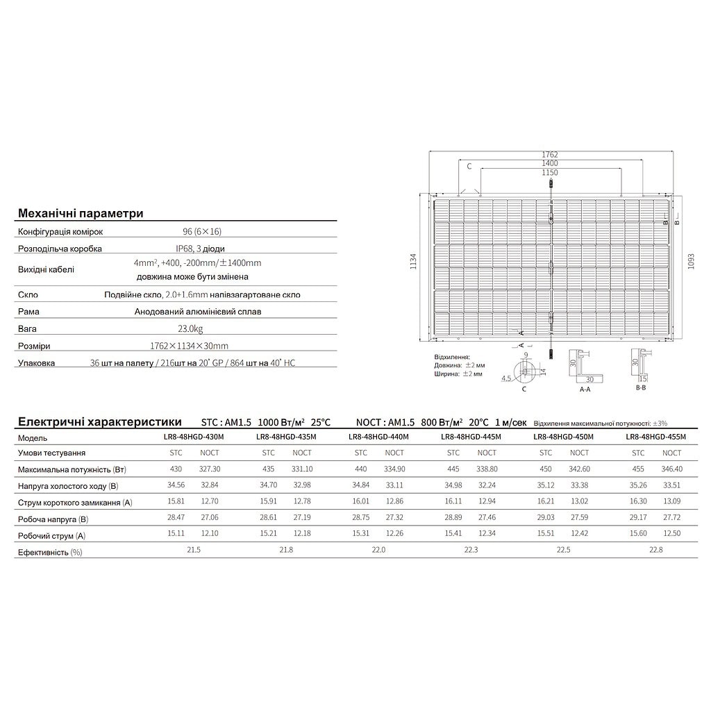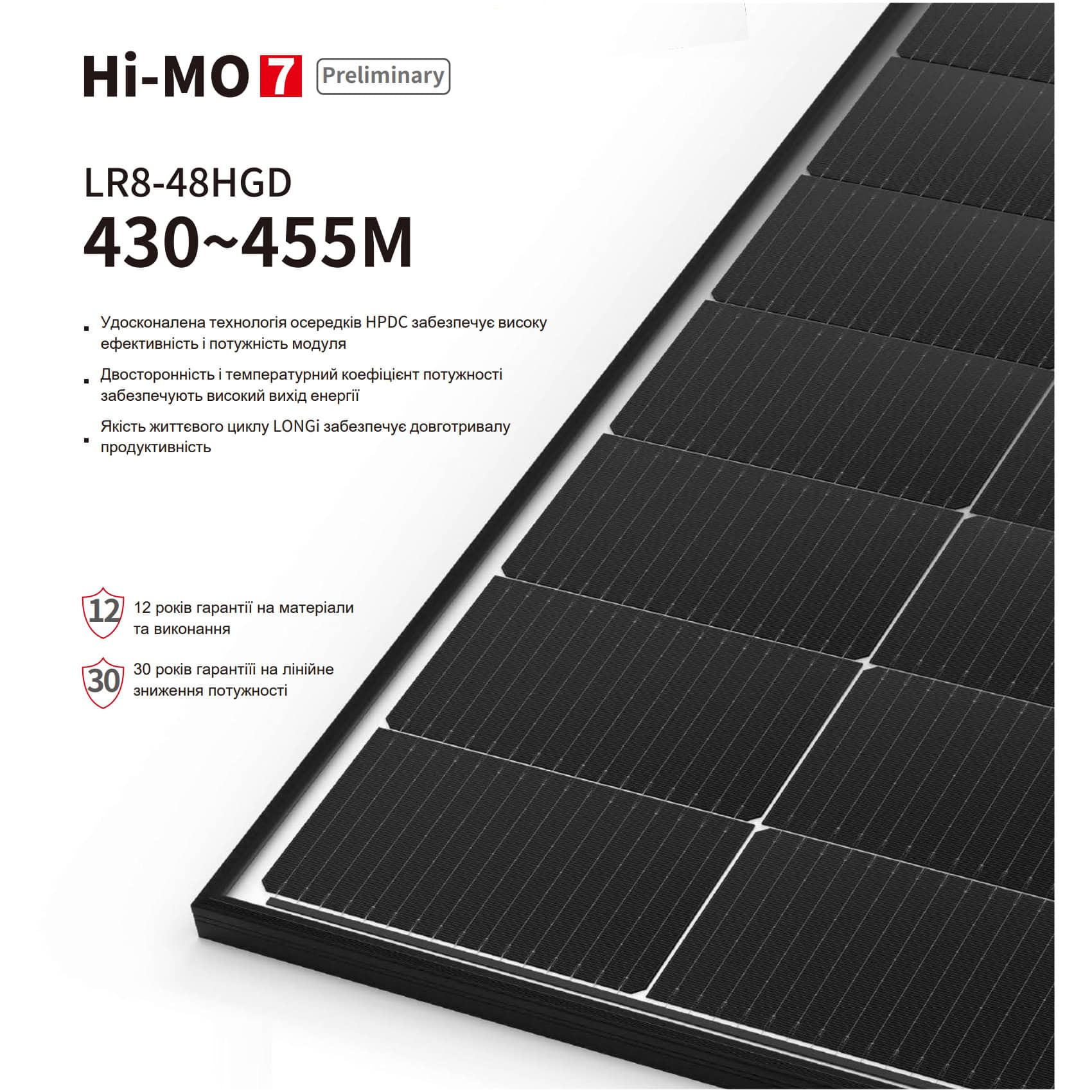 - Гарантія та збереження потужності: 12-річна гарантія на виріб та 30-річна гарантія на вироблення з гарантією понад 87% від номіналу.