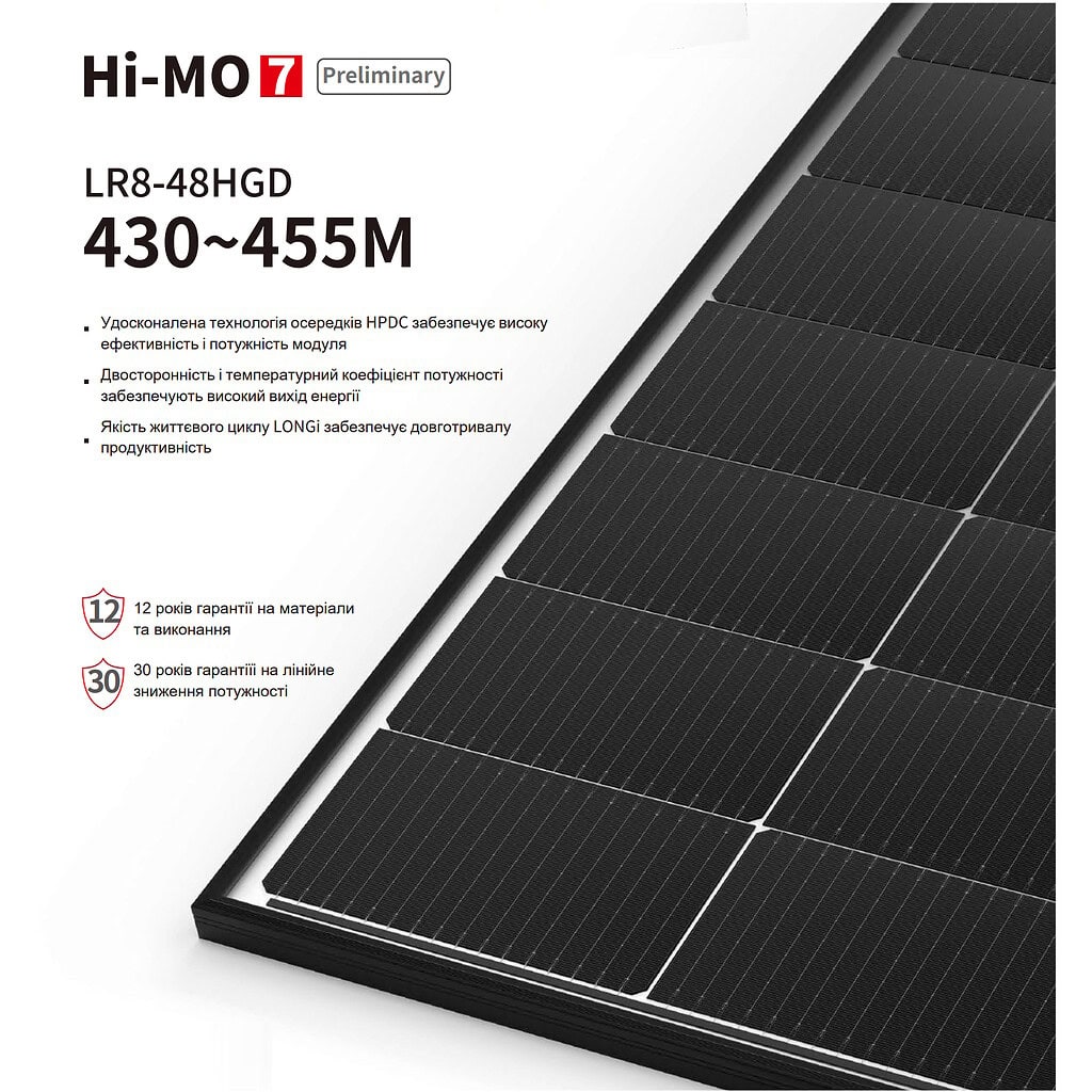 Сонячна панель Longi LR8-48HGD 445W Black-Framed-це високоефективне рішення для вироблення електроенергії, яке відповідає поточним вимогам ринку енергетики. Виготовлена за допомогою технології HI-MO 7, ця модель забезпечує стабільну продуктивність та надійність у різних кліматичних зонах.