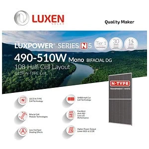 Luxen Solar LNDB-500ND – це високоефективний двосторонній модуль нового покоління, створений на основі N-type осередків з технологією Half-Cell та SMBB (Multi-Busbar). Завдяки цьому панель забезпечує стабільну генерацію навіть в умовах часткового затінення, має нижчий коефіцієнт деградації та підвищену стійкість до ефекту PID.